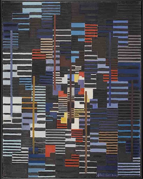 Darkness within the Blue entsteht 1956, als Adolf Fleischmann bereits seit vier Jahren in New York lebt. Wie in Mondrians Broadway Boogie Woogie von 1942/43 verbinden sich in dieser Arbeit die kompositorische und farbliche Strenge mit einem pulsierenden synkopischen Rhythmus – beeinflusst von Erlebnissen in der Neuen Welt. Doch im Vergleich zu Mondrians Bild erhellen nur wenige rote, weiße und gelbe Lichtpunkte die labyrinthische Klaviatur von Darkness within the Blue; ansonsten sind die Farben ins Ocker, Rosa und Braun gebrochen. Die Dominanz des von Schwarz durchdrungenen Blaus bewirkt eine melancholische, abgeklärte Stimmung – wie im Blues. (Marjatta Hölz)