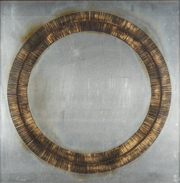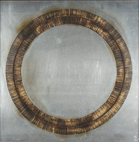 Dessin de feu [Feuerzeichnung] speist sich aus dem Motivrepertoire und den Gestaltungsstrategien, denen Aubertin im Austausch mit den Avantgarden der frühen Sechzigerjahre begegnet war. Auf eine quadratische Metallplatte ist ein zweispuriger Kreisring aus eng aneinandergereihten Streichhölzern montiert, der Spuren einer vom Künstler kontrolliert durchgeführten Verbrennungsaktion aufweist. Mit dem Kreis greift Aubertin einerseits ein unter den ZERO-Künstlern beliebtes Motiv auf, das von der Stunde Null und dem radikalen Neuanfang in der Kunst kündete. Der schlichte Werkaufbau erinnert andererseits an das Flugblatt Zero der neue Idealismus (1963), das den Ideenkosmos der Bewegung auf einer großen Kreisscheibe ausbreitet und ZERO unter anderem mit Feuer, Rauch und Sonne assoziiert. Die in Dessin de feu aus einem alltäglichen Material systematisch gebildete Kreisform sowie der Kontrast zwischen dem kühlen Metall und den Brandresten offenbaren schließlich Aubertins programmatisches Streben nach Objektivität und Realismus in seiner Kunst. Mit seinem Werk gelingt ihm zugleich, über die sichtbaren Spuren des Schaffensprozesses auch der Flüchtigkeit und Vergänglichkeit des Lebens Ausdruck zu verleihen. (Hsiaosung Kok)