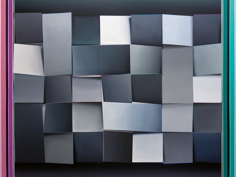 Bachs Streben nach der perfekten Illusion erinnert an den Wettstreit zwischen den antiken Malern Zeuxis und Parrhasios. Nur sind in dem Bild Tetra II nicht naturgetreu abgebildete Früchte oder ein täuschend echt dargestellter Vorhang zu sehen, sondern greifbar erscheinende geometrische Formen, die zu einer tektonischen Komposition zusammengefügt sind. In dem großformatigen Gemälde öffnet sich zwischen seitlich gesetzten, farbigen Balken ein Formgefüge, das wirkt, als hätte der Künstler die Rasterstrukturen der konkreten Kunst in die dritte Dimension überführt. Man meint, ein orthogonales Flechtwerk in unter-schiedlichen Grauschattierungen wahrzunehmen, das – obgleich selbst von zweidimensionaler Qualität – reliefartig in den Raum auskragt.