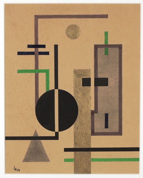 Die Arbeit „Abstrakte Komposition“ aus dem Jahr 1953 lässt Lajos d’Ébneths künstlerische Wurzeln im Konstruktivismus erkennen. Nachdem der gebürtige Ungar Kunst und anschließend Ingenieurwesen in Budapest studiert hat, geht er 1922 nach München zu Franz Stuck. Sein Umzug nach Berlin im April 1923 und das Zusammentreffen mit der lebendigen Kunstszene um László Moholy-Nagy und Herwarth Waldens Galerie „Der Sturm“ lassen d’Ébneth seine bis dahin symbolistisch und expressionistisch geprägten Arbeiten zerstören und einen künstlerischen Neuanfang ganz im Sinne der modernen, konstruktiv-abstrakten Entwicklungen wagen. Von diesem Zeitpunkt an bewegt er sich selbstbewusst in den Avantgarde-Kreisen, zwischen Dadaisten, Konstruktivisten und De Stijl-Künstlern. Besonders profitiert er von dem Kontakt zu Kurt Schwitters, der den jungen Künstler gewissermaßen protegiert. Schwitters verbringt seine Sommerferien 1926 in dem von d’Ébneth bezogenen Haus im holländischen Kijkduin, wo die beiden einen intensiven künstlerischen Austausch pflegen.