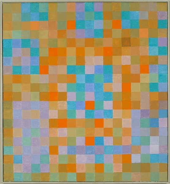 Das Ölbild Orange-Blaugrün-Modulation entstand 1964/65, einige Jahre nachdem Itten seine Leitungspositionen in Schulen und Museen abgegeben und sich wieder intensiv der Malerei zugewandt hatte. Das Schema des Schachbretts empfand er als Befreiung von formalen Fragen und als ideale Möglichkeit, Farbklänge zu studieren. Das Gemälde vereint die von Itten beschriebenen Farbkontraste: den Kalt-Warm- und Hell-Dunkel-Kontrast, den Qualitätskontrast mit durch Weiß getrübten Farben und den Spannung erzeugenden Komplementärkontrast zwischen leuchtendem Blau und Orange. Gemischt ergeben diese ins Violett, Ocker oder Olivgrün tendierende Farbnuancen. Die Modulation von einem Farbton zum nächsten entsteht nicht auf der Bildfläche, sondern im Auge des Betrachters, das die Quadrate summarisch wahrnimmt. Die kontrastierenden Farbfelder erzeugen den Eindruck einer flimmernden Bewegung. (Marjatta Hölz)