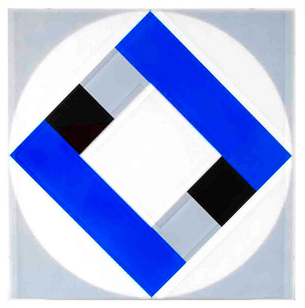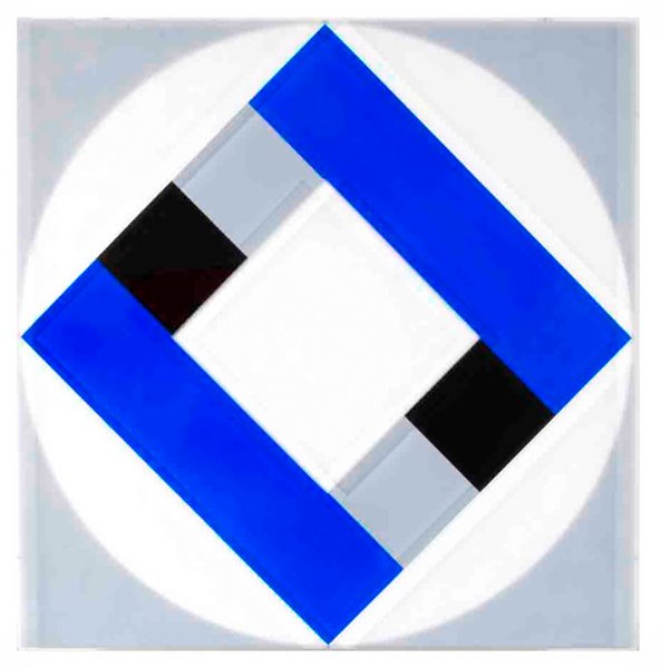 Auf der hinteren Scheibe ist ein quadratischer Rahmen zu sehen, bestehend aus zwei blauen Rechtecken, zwei schwarzen und zwei grauen Quadraten. Er wird von einer kreisrunden weißen Fläche umspielt. Der Farbauftrag erfolgt auf dem Acrylglas in Lasurtechnik. Die Farbschichten bestimmen die Farbdichte und somit die Farbintensität. Das vordere Acrylglas ist geschliffen und matt. Hierbei wurde ein quadratischer Rahmen ausgespart, der einen transparenten, ungetrübten Durchblick auf die dahinter liegenden Farbflächen erlaubt. Durch die Mattierung der vorderen Scheibe wird die scharfe Außenlinie der kreisförmigen Fläche optisch aufgelöst. Eine weitere diffuse Formauflösung ergibt sich, wenn die Arbeit nicht frontal, sondern von der Seite aus betrachtet wird. Mit dem Standortwechsel schiebt sich die matte Scheibe über die Farbflächen und führt auch hier zur Konturauflösung. Der „Luftraum“, wie Marguerite Hersberger den Abstand zwischen den Scheiben bezeichnet, ist hierbei entscheidend. Er gibt dem geometrisch Berechenbaren etwas Unberechenbares.