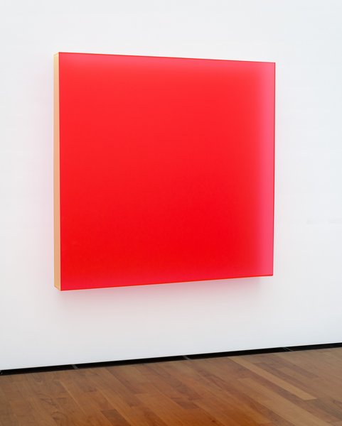 Die Arbeit colormirror farbrausch III gehört zu einer 2010 begonnenen Reihe gleichartiger quadratischer Bildkästen, die Regine Schumann zunächst in vier unterschiedlichen Farben realisierte. Bestanden ihre Leuchtobjekte lange Zeit aus eingefärbten transparenten Acrylglasplatten, setzte sie hier erstmals satiniertes farbiges Acrylglas ein, das den Arbeiten eine besonders samtige Anmutung verleiht. Mit sicherem Gespür für Farbe und Farbwirkungen lotet sie die Möglichkeiten des transluziden Materials aus. Die Künstlerin, die die Herstellung ihrer Acrylglasobjekte regelmäßig einem Kunststoffverarbeiter überantwortet, ist bis heute durch und durch Malerin geblieben. Dementsprechend folgt auch colormirror farbrausch III malerischen Prinzipien: Die satinierte Vorderseite kombinierte Schumann mit transparenten Seitenflächen und einer metallisch pigmentierten, golden schimmernden Rückwand, die das einfallende Licht reflektiert und dadurch den energetischen Charakter des Objektes verstärkt. Farbe und Licht verschmelzen in dem Werk zu einem sinnlichen roten Farbraum, der in den Ausstellungssaal hineinstrahlt.