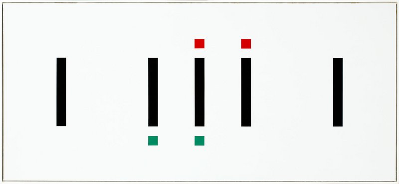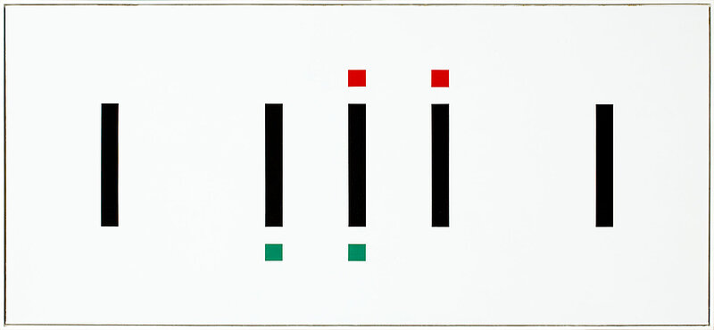 Anfang der Siebzigerjahre entschied sich Brandt, seine Kompositionen allein aus orthogonalen Formen aufzubauen, was sein persönliches Bedürfnis nach Regelmäßigkeit widerspiegelte. Mit der Beschränkung auf rechtwinklige Bildelemente gründete er seine Werke auf eine logische Ordnung. Die Kompositionen leiteten sich nun aus dem Grundmodul des Quadrats ab, das er zu größeren Einheiten zusammenfasste. Stand er mit diesem Ansatz in der Tradition der Väter der Konkreten Kunst, so ging es Brandt vor allem um eine Harmonie, die er aus der grundlegenden Ordnung eines Bildes gewinnen konnte. Schwarz mit Grün und Rot zeigt exemplarisch eine Bildauffassung, die sich in seinem Werk ab Ende Neunzigerjahre durchsetzte. Auf einer querrechteckigen Leinwand entwickelt sich eine gleichmäßige, symmetrische Struktur gleicher Elemente analog zur europäischen Leserichtung von links nach rechts über die Fläche. Der Künstler möchte hier eine „Grundwahrheit des Sehens“ sichtbar machen, den Blick des Betrachters gezielt über die Fläche lenken. In der Reihung der einzelnen Balkenformen stellt er Fragen nach Anfang und Ende, nach Rhythmus, Bewegung und Raum. Es ist zudem der mit weißer Farbe gefüllte Raum zwischen den rechtwinkligen Elementen, der bei Brandt besondere Beachtung verdient. Das spannungsvolle Verhältnis zwischen Leere und Motiv wie auch das auffallend langgestreckte Bildformat sind mit der ostasiatischen Landschaftsmalerei vergleichbar. Gewiss ließ sich der Künstler von den Weiten der norddeutschen Landschaft inspirieren, wo er von 1986 an lebte. (Susann Scholl)