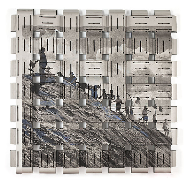 Die Abbildung wurde zunächst in Streifen zerlegt, dann mittels Siebdruckverfahren auf Kartonstreifen übertragen und anschließend, in Analogie zur Herstellung von Textilien, zu einer neuen Bildstruktur verwoben. Solchen Geweben begegnen wir häufig bei Bayrle, der vor seiner künstlerischen Laufbahn eine Ausbildung zum Weber absolviert hat. Für ihn ist das Gewebe eine Metapher für die Gesellschaft, oder, wie er es formuliert: „Das Individuum ist der Faden, die Masse der Stoff.“ Und so wie die Gesellschaft voller Brüche und Verwerfungen ist, so haben sich auch in das regelmäßige Auf und Ab von Kette und Schuss im Raster seines vorliegenden Werks Unregelmäßigkeiten in die Webstruktur eingeschlichen. Doch hinter den vermeintlichen Webfehlern steckt wohldurchdachtes Kalkül: Der Verlauf der Kartonbahnen zeichnet nämlich ein chinesisches Schriftzeichen nach. Es ist das Zeichen für den Begriff „Epoche“, der gleichzeitig eine Art Untertitel dieses Werkes ist. Somit wird diese Arbeit zur Metapher für einen konkreten Abschnitt chinesischer Geschichte – die Epoche des Maoismus. (Camilla Bonath-Völkel)
