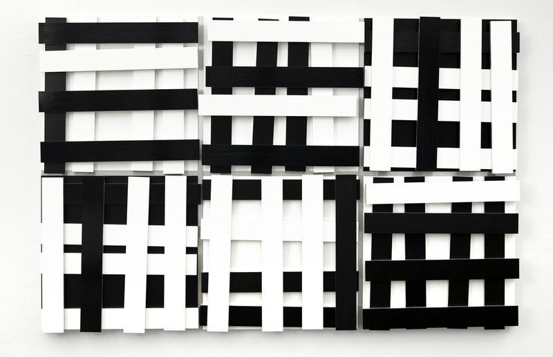 Gleiches gilt für die großformatige Arbeit Weiß Schwarz 15. Knoebel kombiniert das maschinell gefertigte Trägermaterial Aluminium mit einem ausgesprochen sinnlichen Farbauftrag: Er erfolgte in mehreren Schichten, wobei die unteren farbig sind und stellenweise durchschimmern sowie an den Rändern minimal hervorblitzen. Zudem verleiht ein lebhafter, deutlich sichtbarer Pinselduktus der Oberfläche eine ausgesprochen malerische Qualität. Die Komposition besteht aus sechs quadratischen Aluminiumtafeln, die der Künstler in zwei Dreierreihen zum Rechteck anordnete. Auf die Metallplatten hat er jeweils vier senkrechte und vier waagerechte Aluminiumlatten gesetzt, die sich zu einer unregelmäßigen Gitterstruktur überlagern. Dem systematischen Aufbau der Arbeit steht die Ungenauigkeit der Rasterbildung ebenso gegenüber wie der freie Wechsel von Schwarz und Weiß, dem keine erkennbare Gesetzmäßigkeit zugrunde liegt. Allein aus dem ausgewogenen Verhältnis der Bildelemente bezieht die auf den ersten Blick willkürlich gesetzte Komposition eine grundlegende Ordnung. (Susann Scholl)