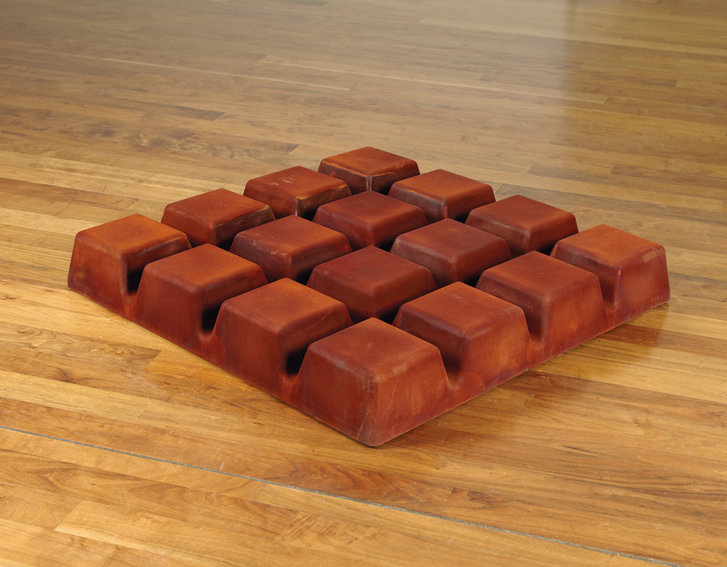 Thomas Rentmeisters Eisenschokolade besticht durch die massive Materialität des Eisengusses, ihre rigorose Geometrie und ihre unvermittelte räumliche Beziehung zum Betrachter, mit dem sie das Terrain teilt. Aufgrund der seriellen Gliederung in vier Mal vier quaderförmige Erhebungen ist die gerade einmal knöchelhohe Plastik von allen Seiten gleich anzuschauen; ihre schlichte, übersichtliche Form schließt Pathos und eine hierarchische Lesart vollkommen aus. Umso eindringlicher kommen in dieser elementaren Gestaltung die spezifischen Eigenschaften des Gusseisens zur Geltung: Im Ganzen betrachtet, erscheint das Werk schwer, hart und kalt; seine Oberfläche jedoch hat eine dichte Oxidationsschicht ausgebildet, die das kompakte Material in eine rostrot-warme, samtene Hülle kleidet. So wird die ästhetische Wirkung der Eisenschokolade nicht nur von ihrer soliden Präsenz bestimmt, sondern auch von einer berührungsempfindlichen, farblich changierenden Patina, die – als Ergebnis des Korrosionsprozesses – der starren Form eine veränderliche Erscheinung verleiht.