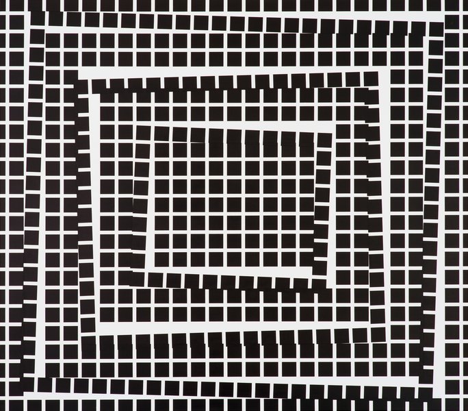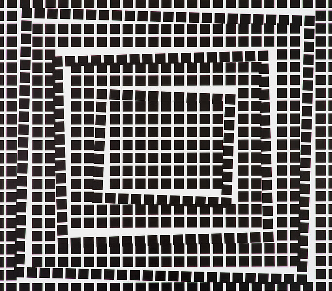 Anders als bei Morellet, der vielfach ein zugrundeliegendes System über das visuelle Resultat entscheiden ließ, ist es bei Stocker der kognitive Prozess des Sehens, den die Künstlerin zum Ausgangspunkt ihrer Arbeiten nimmt. Wie auch in dem vorliegenden Gemälde aus dem Jahr 2015, bewegt sie sich mit dieser Fragestellung in inhaltlicher Nähe zur Op-Art. Wie ist das Verhältnis von Vorder- und Hintergrund? Sehen wir in erster Linie eine weiße Gitterstruktur auf schwarzem Grund? Oder nehmen wir eher schwarze Quadrate auf weißem Grund wahr? Dabei steht die querrechteckige Leinwand in Spannung zum Quadrat als Basismodul der Komposition. Das Rasterfeld wird mehrfach gekippt und aus den orthogonalen Bildachsen gedreht, sodass es sich in viele schräg zueinander verlaufende Streifen teilt. Das gesamte Bildfeld gerät damit scheinbar ins Schwanken, und es entsteht ein räumlicher Eindruck. Schauen wir auf die keilförmigen Leerstellen und den Bildrand, der das Quadratraster „anschneidet“, treten die weißen Partien optisch stärker in den Vordergrund. Auf diese Weise aktiviert und irritiert Stocker den Wahrnehmungsprozess des Betrachters und führt ihm wortwörtlich das eigene Sehen vor Augen. (Susann Scholl)