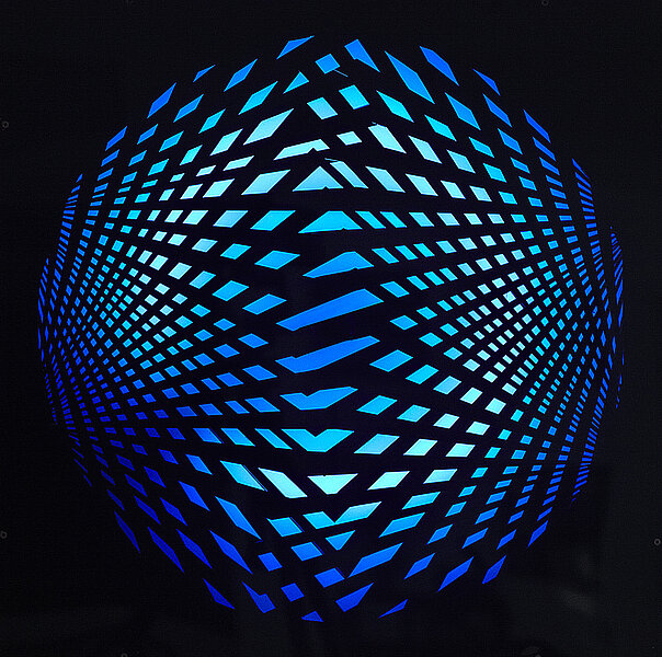 Mit der Werkgruppe Schemi luminosi schuf Grazia Varisco eine Reihe von leuchtenden Objektkästen, die ein rotierendes, sich kaleidoskopartig veränderndes Bild von Rasterverschiebungen und -überlagerungen erzeugen. Licht und Bewegung generieren vielseitige visuelle Wahrnehmungen und animieren den Betrachter zu einem aktiven, bewussten Sehen. Schema luminoso. Variabile 3D von 1964 besteht aus einer mit schwarzem Winkelmuster strukturierten Kreisscheibe, die im Kasteninneren von einem Motor angetrieben wird. Eine gleichartig gemusterte Plexiglasscheibe schließt das Objekt nach vorne hin ab. Während der Rotation entstehen immer neue Strukturen, die den Eindruck eines mal mehr, mal weniger gewölbten Raumes vermitteln. Durch den Kontrast zwischen dem von einer Leuchtstoffröhre erhellten Hintergrund und den schwarzen Linien im Vordergrund eröffnet sich zudem eine starke Tiefenräumlichkeit. Raum, Licht und Bewegung vereinen sich zu einem faszinierenden Bild, das sich mit jedem Wimpernschlag verändert. (Jutta Fischer)