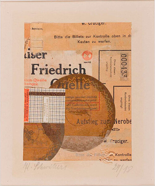 Die Collage Kaiser-Friedrich-Quelle von 1924 gehört zu seinen Merzzeichnungen, wie er kleinformatige, geklebte und manchmal übermalte Kompositionen selbst nannte. Zusammengesetzt aus unterschiedlichen Fundstücken wie Kontrollabschnitten, Schokoladenpapier, transparenter Pralinenverpackung und einer Flaschenbeschriftung der Heilwasser-Marke Kaiser Friedrich Quelle ergibt sich eine Bildkomposition, die im Wesentlichen aus horizontal und vertikal ausgerichteten Elementen besteht. Zwei sich überlagernde Kreisformen ragen vom unteren linken Bildrand bis ins Zentrum und brechen die strenge Ordnung auf. Die durchsichtigen Materialien geben den Blick frei auf darunterliegende Flächen, wodurch eine räumliche Wirkung entsteht, die auf eine kubistische Durchdringung der Fläche ins Räumliche verweist. In ihrer haptischen Qualität betonen die Knitterfalten des Verpackungsmaterials darüber hinaus den sinnlichen Charakter der Arbeit und verleihen ihr eine zusätzliche Expressivität. Der insgesamt geometrisierte Bildaufbau verweist auf den Stil des internationalen Konstruktivismus, mit dem sich Schwitters seit 1923 auseinandersetzte und dessen Erfolg mit seinem eigenen als avantgardistischer Künstler einherging. Seine Stellung als Vorreiter neuer Strömungen zeigt sich nicht zuletzt durch die verschiedene Kunstgattungen kombinierende Vorgehensweise. Die enge Verbindung etwa von Text und Bild, Literatur und bildender Kunst sprengt schon früh im 20. Jahrhundert Gattungsgrenzen, die ganz seiner individuellen Vorstellung der Merzkunst entsprachen und späteren Kunstformen wie Pop-Art oder Fluxus den Weg bereiteten. (Jutta Fischer)