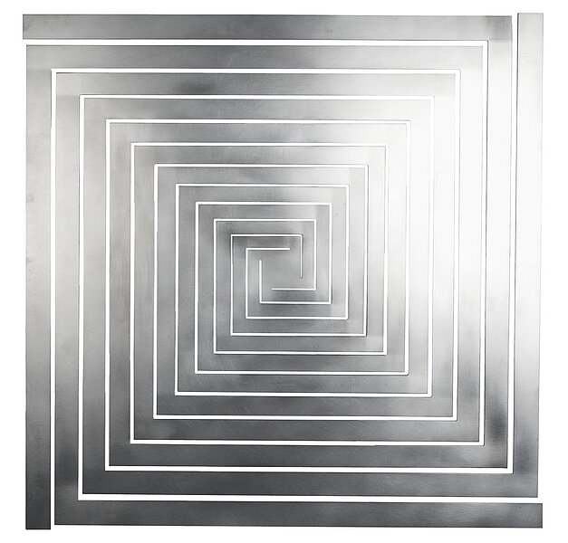 Bewegtes Quadrat schuf Willing aus einer vorgespannten Titanplatte. In jeweils gleichem Abstand an den vier Ecken der Fläche beginnend, setzte er parallel zu den Seitenkanten des Quadrats präzise lineare Schnitte, die an den imaginären Diagonalachsen der Platte im rechten Winkel abknicken, in Richtung Mitte streben und so die vormals plane Fläche in ein instabiles Gebilde aus immer schmaleren Bändern auflösen. Die Bänder laufen im Zentrum der Arbeit zu einem kleinen Quadrat zusammen, an dessen Rückseite das Objekt an der Wand befestigt ist. Suggeriert die spiralförmige Lineatur bereits eine gewisse Tiefenräumlichkeit, so drängt die trichterartige Gesamtform der Arbeit real in den Umraum vor. Durch einen sanften Stoß in Bewegung versetzt, beginnt das Werk, rhythmisch zu schwingen: Gleitende Wellen breiten sich dann über die schimmernden Oberflächen aus, bis das Objekt allmählich in den Ruhezustand zurückkehrt. (Camilla Bonath-Völkel)