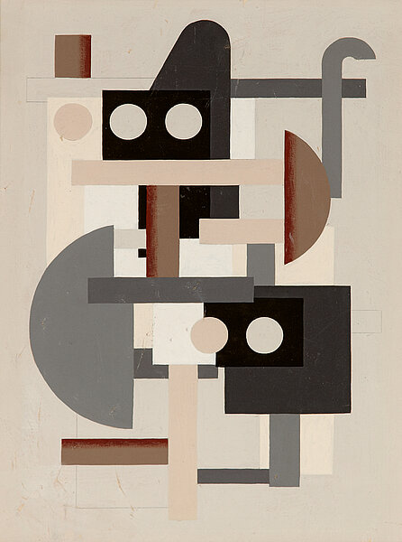 It was in this vain that he painted his "Abstraktion auf Hellgrau" [Abstraction on Pale Grey] in 1927. This composition – done in pencil, opaque white and body colours in various shades of grey, pink and brown on a grey background – is dominated by geometrical shapes that are reminiscent of machine parts. These elements, which extend over the entire of the vertical format painting – squares, rectangles, bars, round and semicircular shapes – appear to be floating in an imaginary space. They seem to be nested inside one another, pieced together and intersecting or overlapping so as to generate a spatial dimension without actually pin-pointing the spatial relationships. The arrangement of the elements is exactly balanced. In a perfect dialectic, Baumeister has created a tension between horizontals and verticals, black and white, squares and circles – so that each element finds it counterweight on the picture surface in both form and colour. With the exception that is of the diagonal formed by the left margin of the grey cone-like shape on the upper edge, which has no corresponding element. This shape marks the central axis and the apex of the composition and forms a kind of climax within the carefully balanced visual architecture. (Camilla Bonath-Völkel)