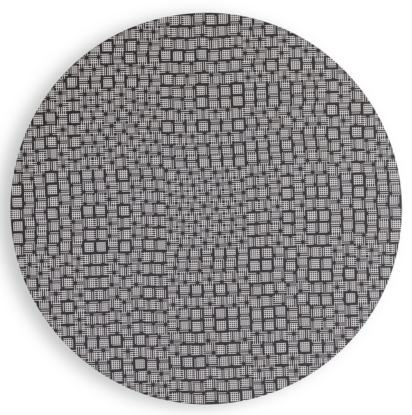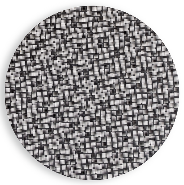 Impressed by American Abstract artists such as Ad Reinhardt and Josef Albers, whose works the Finnish artist came to know during his stays in the USA in 1967 and 1970, he began to produce strictly logical serial paintings using acrylic paint and adhesive tape. The resulting insights were then employed from 1978 onwards in three-dimensional works. But painting has remained for him the more appropriate avenue for visualizing abstract ideas, because the third dimension tends to hinder an illusion from being embodied, as the artist remarked in an interview. In this combination of circular format and black-and-white modular connections, Kujasalo has produced an abstract visualization of such topical phenomena as the global network, whose secret order the viewer can try to trace out in the picture surface. (Jutta Fischer)