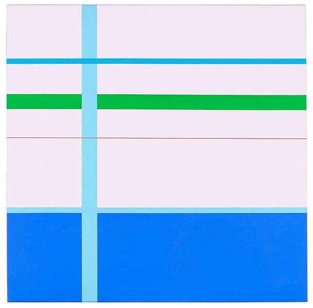 While in the 1990s Miriam Prantl actually created her wall reliefs by superimposing wooden surfaces on top of one another so that they created their own space, in her “manifolds” series she has arrived at a far subtler effect through the interplay of colour, line and surface, which creates an illusion of space on the canvas. But these painterly works are also marked by the finest soupcon of relief because the linear elements have been realized using adhesive or cloth tape. The spatial illusion that opens up before the viewer’s eyes in “manifolds 11c” is produced by a system of coordinates made up of rectangular lines and stripes; these produce a net whose openings grant a glimpse of virtually boundless or limited spaces whose chromatics determine the apparent extension of the seemingly spatial surfaces.
