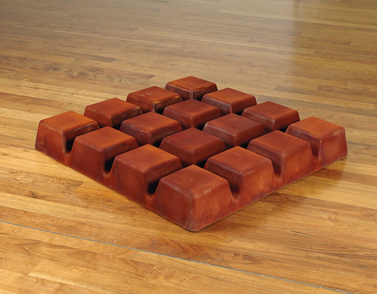 Thomas Rentmeister’s Eisenschokolade [Iron Chocolate] seduces us through the massive materiality of its cast iron, the rigour of its geometry, and its direct spatial relationship to the viewer with whom it shares its terrain. Thanks to its serial division into four by four cuboid elevations, the no more than ankle-high sculpture presents the same view from each side; its plain and simple form totally excludes any hint of pathos and any hierarchical reading. Which means that the intrinsic properties of cast iron are given far more emphasis in this elementary configuration: viewed as a whole, the work seems heavy, hard and cold – and yet an oxidised surface envelops the compact material in a warm, velvety coat of rust red. Thus the aesthetic effect conveyed by the Eisenschokolade is not merely determined by its solid presence, but also by a scintillatingly coloured patina that is sensitive to the touch – the outcome of corrosion that gives the rigid shape a changing appearance.