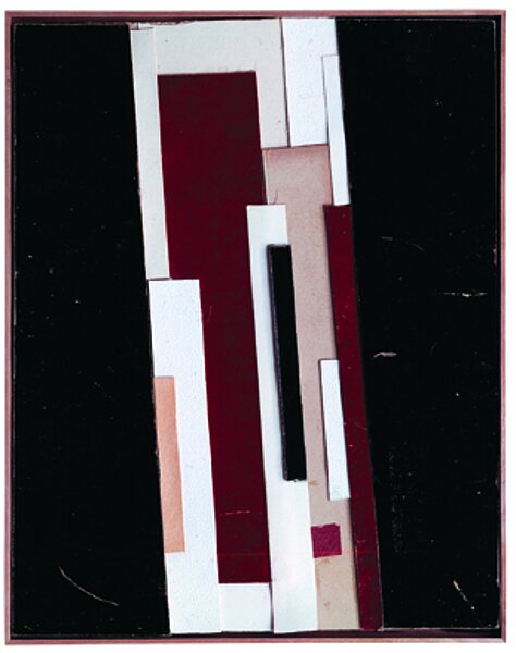 This “Suprematist Composition” was done at a time when Ilya Chashnik was employed as Malevich’s scientific assistant at the St Petersburg Academy of the Arts. The relief consists of a stripe set on a diagonal made of red, white, black and yellow card, and flanked on both sides by black surfaces. A number of other similar works are known from the artist under the same title, in which the lateral surfaces are also sometimes in red or white. As a result of the way the stripes with their differing lengths and breadths point beyond the picture margin, they suggest a dynamism of the kind one sees when looking down at a busy street from above. This relief is an example of how Chashnik wished to see Suprematism develop. After surmounting the first stage, the "black" period of Suprematism, not simply single shapes but whole series of shapes were to be catapulted into a dynamic state. (Marjatta Hölz)