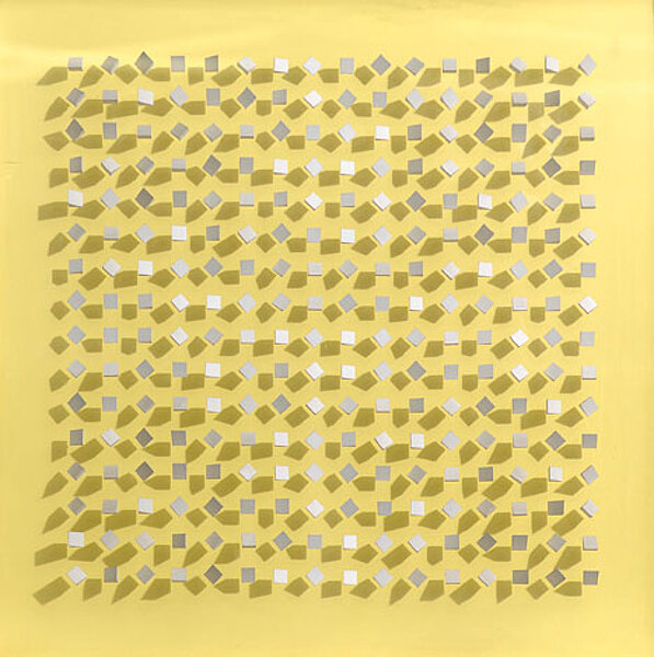 Since the 1960s, Staudt has produced a number of systematic, constructive works using a semi-relief form and monochrome colours. In these works he arranges individual geometrical shapes on a flat background to produce serial structures. Often the compositional micro-element in these early pieces is the cube, the three-dimensional equivalent of the square, or a partial form created by its analysis. Periphere Verdichtung [Peripheral Aggregation] dating from 1965/67 belongs to this group of works. Set against a yellow rear panel, a total of 16 x 16 cubic segments of wood have been arranged to form a square relief. A transparent sheet of Perspex closes off the work at the front to form a showcase. The prismatic forms have been distributed at equal intervals. They come in eight different heights, increasing to the left and right margins, and thus aggregating at the periphery. Klaus Staudt has painted the wooden elements completely in white, a non-colour he was particularly fond of in his early work on account of its immateriality and its openness as regard content. The cubic segments alter their position in space according to a specific system, and cast strong shadows on the yellow background. This play of light and shade shapes the space and brings out fine tonal nuances, and as in all of the artist's reliefs is an intrinsic part of the work. The wooden elements have been placed at some remove from the rear wall so that, weightless and without anchor, they seem to float silently in the showcase. It is Staudt's secret just how he achieves this fascinating effect. (Barbara Willert)