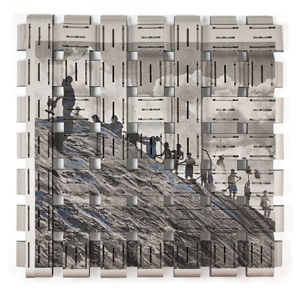 Sandwerfer (Zeichen für Epoche) [Sand Casters (Character for Era)] is one of a series that Thomas Bayrle first created in 2005 after a several-month stay in China, and for which he recruited photos from Chinese propaganda leaflets published during the Mao era. The relief-like work, which assumes a three-dimensional space, consists of a square weave of strong card printed with one of the photographic motifs. It shows people on a mound, busy shovelling sand. Shot against the sky from a low, dramatic angle in black and white, the mound appears almost monumental while the people on it look tiny. Their individual physiognomies can be scarcely made out in the grainy depiction; they stand out against the sky like shades. Robbed of their individual features, they become indefinable parts of a mass, a collective whose interests – according to the rhetoric of communist propaganda – go before those of the individual. The phenomenon of the mass or crowd is a central theme in Thomas Bayrle’s work. Inspired by Siegfried Kracauer’s Weimar essays The Mass Ornament (1963, English 1989) and Elias Canetti’s Crowds and Power (1960, English 1962), since the mid-sixties Bayrle has taken a long look at mass society and the de-individualisation of the person.