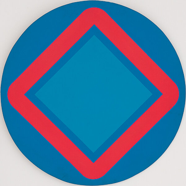 Already the title Diamond Blues III names the key elements of the painting: the diamond shape and the two shades of blue. The circular canvas with its blue ground shows a square done in a paler blue that has been set on one corner and enclosed in a red frame. While a blue disc is associated with a mandatory road sign, the red diamond suggests a right of way sign. Gaul defamiliarises the sign language we are accustomed to by manipulating the colours, heightening their impact through new contrasts, and by allowing the red shape to stand out visually. With that, inner and outer form, content and colouration enter a charged relationship that subverts the code employed in real traffic signs. Diamond Blues III emphasises its symbolic character through the stereotypically reduced, geometrical grammar of forms and the brash use of blazing colours. Unhampered by any message bound to conventions, the painting is part of a new visual system freely invented by the artist, and is not intended to convey any meaning. (Camilla Bonath-Völkel)